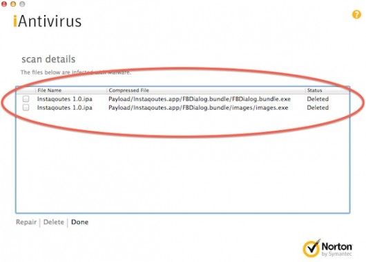 Per testare l’applicazione, abbiamo scaricato il pacchetto Instaquotes dal negozio di iTunes, e abbiamo esegutio la scansione con il programma di Antivirus gratuito di Symantec. Il risultato è che il pacchetto contiene i seguenti due file eseguibili di Windows, i quali sono contrassegnati come malware: