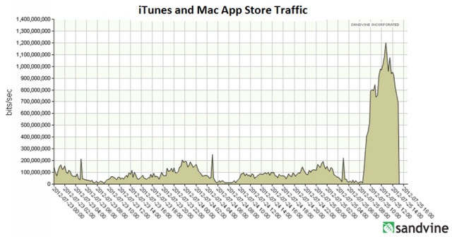 Sandvine ha scattato l’istantanea del traffico su iTunes e Mac App Store che si vede in figura alle 3 pm EST il 25 Luglio.