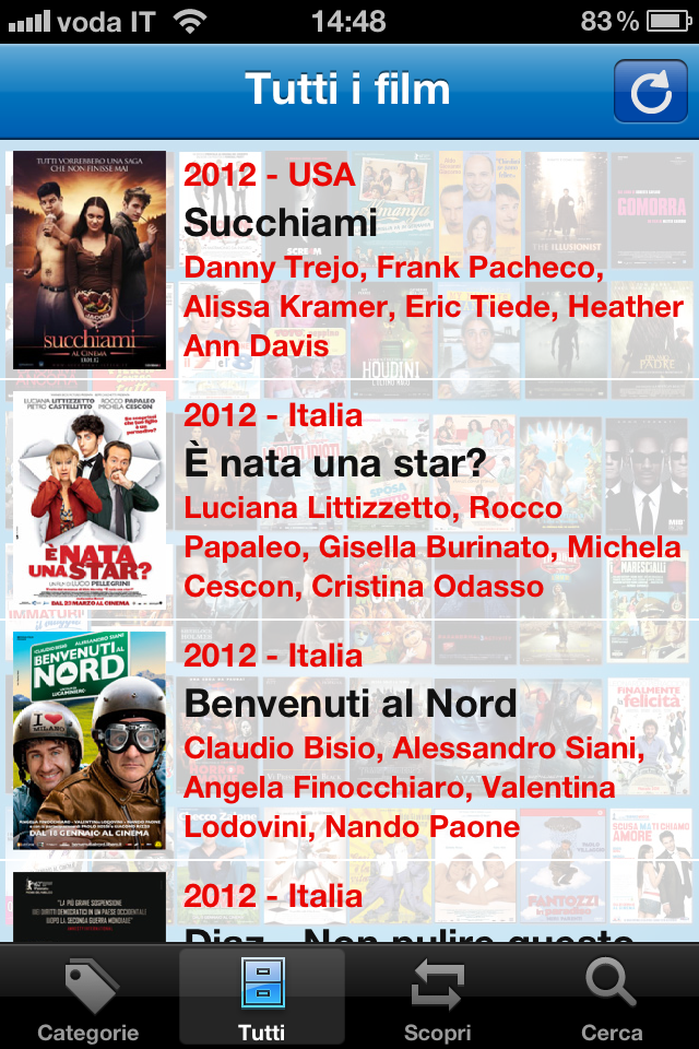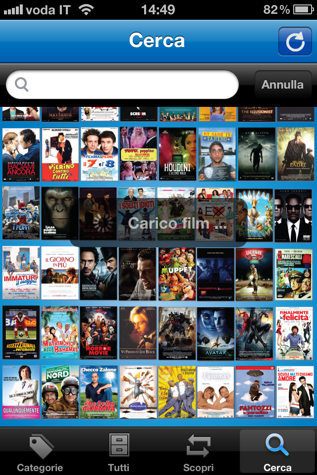 Oltre alla sezione delle categorie, sono disponibili le sezioni Tutti ,la quale fornisce un elenco di tutti gli elementi integrati nell’applicazione ordinati secondo la data di uscita al cinema, Scopri, sezione dalla quale sarà possibile accedere ad un filmato suggerito casualmente dall’app stessa, e Cerca con cui potrete inserire il nome di un film da cercare nel database dell’applicazione.