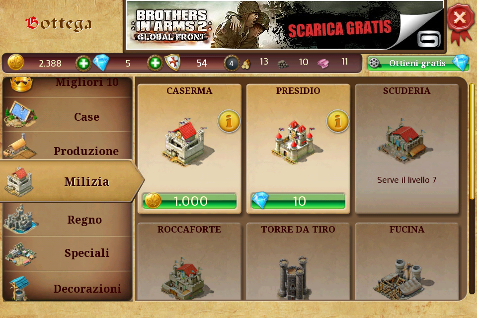 Avremo a disposizione una bottega dalla quale potremo comprare tantissime strutture per migliorare il nostro villaggio. Strutture più importanti saranno accessibili a livelli più alti, e sono davvero tantissime le sezioni da cui poter acquistare nuove attrezzature, decorazioni, ecc.