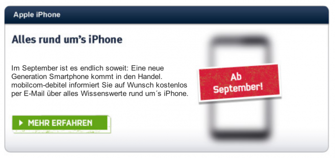 Ovviamente nulla di completamente certo, ma non per Mobilcom-Debitel. Secondo i contenuti riportati sul sito dell’operatore telefonico tedesco una “nuova generazione di smartphone” arriverà proprio nel mese prossimo. Sebbene anche Verizon avesse annunciato l’arrivo di un nuovo dispositivo addirittura rivoluzionario, in questo caso la fonte parla senza mezzi termini: nell’immagine sovrastante è chiaramente presente la parola “iPhone”.