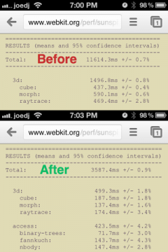 I risultati? Stupefacenti. Questo tweak, secondo noi, è uno dei più riusciti e fondamentali disponibili su Cydia. Un vero e proprio assoluto must have per i nostri iPhone jailbroken. Con questo tweak Chrome è quasi 4 volte più veloce. La piattaforma di benchmarking Sun Spider, per alcune operazioni, registra incrementi prestazionali di ben 8 o 9 volte superiori rispetto alla versione che utilizza in vecchio engine JavaScript.