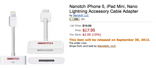Su Amazon.com compare il primo adattatore Lightning-30pin prodotto da terze parti, in questo caso venduto da Nanotch. In pratica questo adattatore dovrebbe permettere di utilizzare su iPhone 5 i cavi USB compatibili con le precedenti generazioni di iPhone. Queste le caratteristiche tecniche dichiarate: