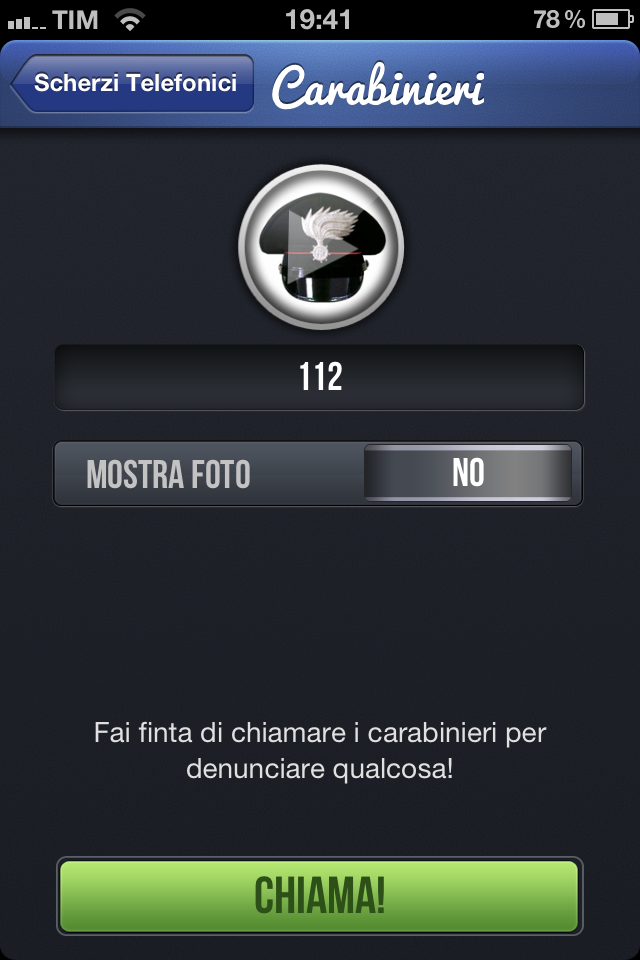 Gli scherzi disponibili appena scaricata l’applicazione sono solo 5 di cui 3 simulano una ricezione di una chiamata da un amico, da una fidanzata dall’accento romanesco e da un maniaco, mentre altri due simulano una finta chiamata ai carabinieri e ad un ospedale psichiatrico (questi ultimi due veri e propri must).