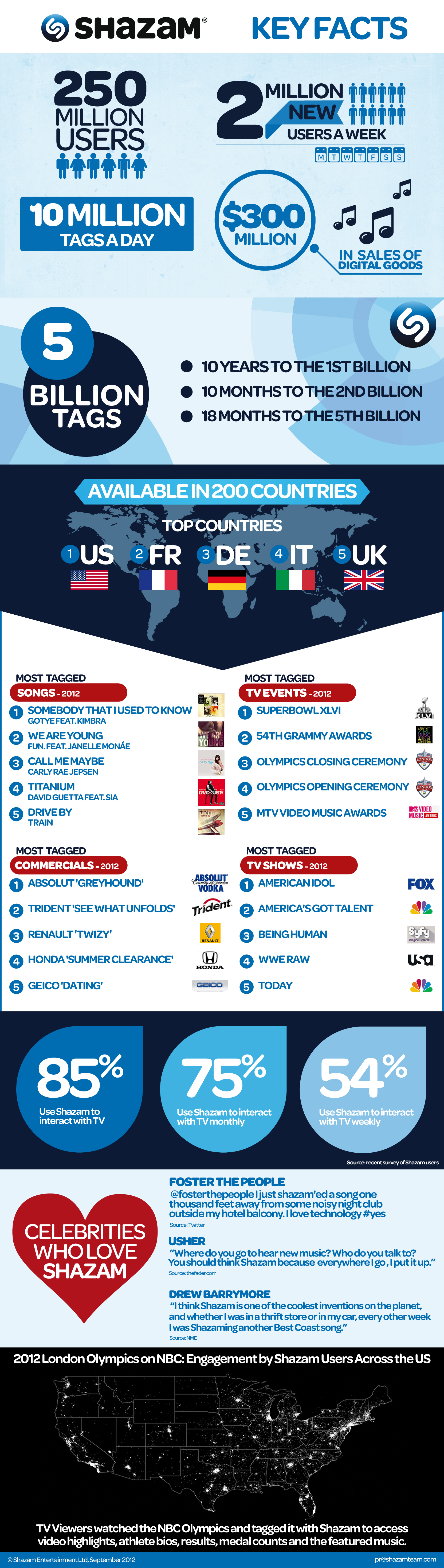 “Secondo studi di settore, l’88% dei possessori di smartphone usa il telefono cellulare mentre guarda la TV e, con la nostra espansione anche sul mercato televisivo, abbiamo registrato un aumento dell’attività a fronte di eventi recenti abilitati su Shazam come la trasmissione delle Olimpiadi su NBC, dove più di un milione di persone ha taggato la cerimonia di chiusura, così come gli US Open di tennis trasmessi dalla CBS all’inizio di questo mese” prosegue Fisher. “Pensiamo che ampliare la nostra offerta TV e mettere a disposizione funzionalità social più complete sarà ciò che guiderà la strategia di Shazam nei prossimi mesi”.