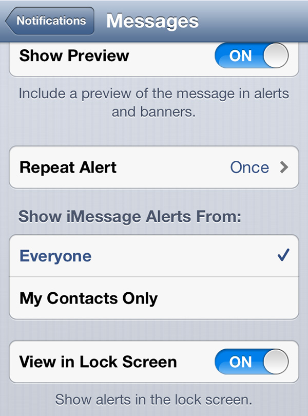 - È possibile selezionare se ricevere sempre la notifica di un nuovo iMessage oppure solo se proviene da un contatto della nostra rubrica.