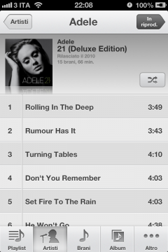 Comunque si può affermare con certezza che per la prima volta l’app Musica ha ricevuto un importante restayling grafico. Come potete vedere dagli screenshot qui in basso, i colori nero e blu di iOS 5 vengono sostituiti da un grigio chiaro. Quindi il tutto diventa più monocromatico e meno vivace, ma probabilmente questo si intona con lo stile delle nuove app di iTunes e App Store le quali usano principalmente il grigio chiaro.