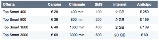- Top Smart 400: offre: 400 minuti di chiamate gratuite, 100 SMS e 2GB di internet. Il costo è di: 29€ al messe + Tassa governativa (5,16€). Inoltre andrà versato un anticipo di 159€ di cui però 60€ verranno rimborsati in fattura, andando effettivamente a pagare un anticipo pari a 99€