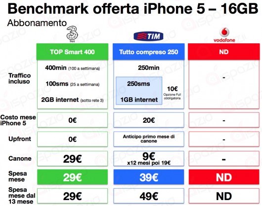 Con l’offerta TIM di quest’anno prendere un iPhone 5 da 16 GB con la “Tutto Compreso 250“, comporta un costo complessivo di 54€ al mese, diviso in 29€/mese per l’offerta (19€ solo se si passa a TIM) + 5,16€ di tassa governativa + 20€ mensili per il telefono. Rispetto a Vodafone il risparmio è di 4€ mensili ma gli svantaggi sono evidenti: solo 250 SMS/chiamate verso tutti ed 1GB di internet illimitato contro i piani voce ed SMS illimitati con 2GB di internet offerti dalla Vodafone. Tim inoltre, offre la Tutto Smartphone. Per certi versi l’offerta è molto simile alla Scegli 30 di Tre: Con un costo di 10€ al mese + 20€ mensili per il telefono.