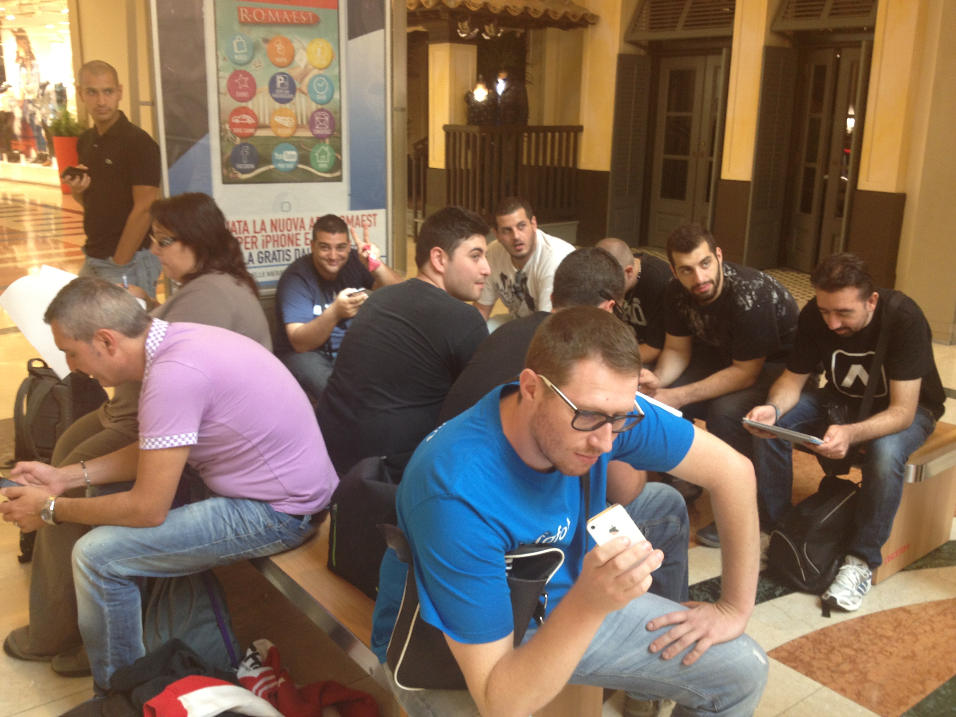 – Luca torna da Porta di Roma a Roma EST. Sono stati lasciati i nostri Gadget a Gimmy, abbiamo parlato con diversi utenti e sviluppatori ed abbiamo appreso che circa 100 persone sono in coda a Porta di Roma, mentre ce ne sono 200 a Roma EST. L’iPhone 5 è stato molto criticato, sembrava che nessuno lo volesse acquistare ma le code non hanno precedenti nel nostro Paese. Rispetto al lancio dell’iPhone 4S sono almeno del 50% più lunghe!