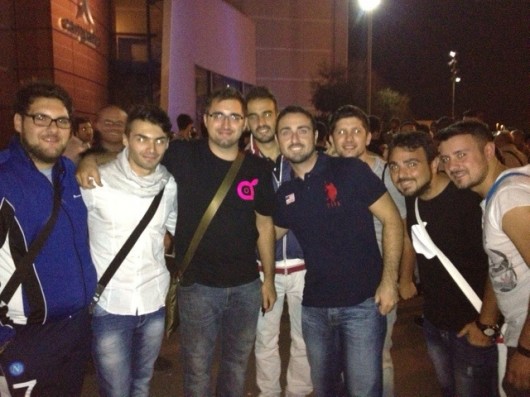 Ore 02:30 – Una foto di gruppo dal Campania. Anche qui di dormire non se ne parla. Siete in tanti a Caserta intorno a noi. Da Napoli particolarmente, ma anche da Roma e dalle altre città di Italia, si sente particolarmente il vostro affetto. Grazie!