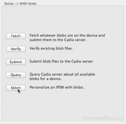 Fase 5: Aprite RedSn0w e cliccate sulla voce Extras > SHSH blobs > Stitch.
