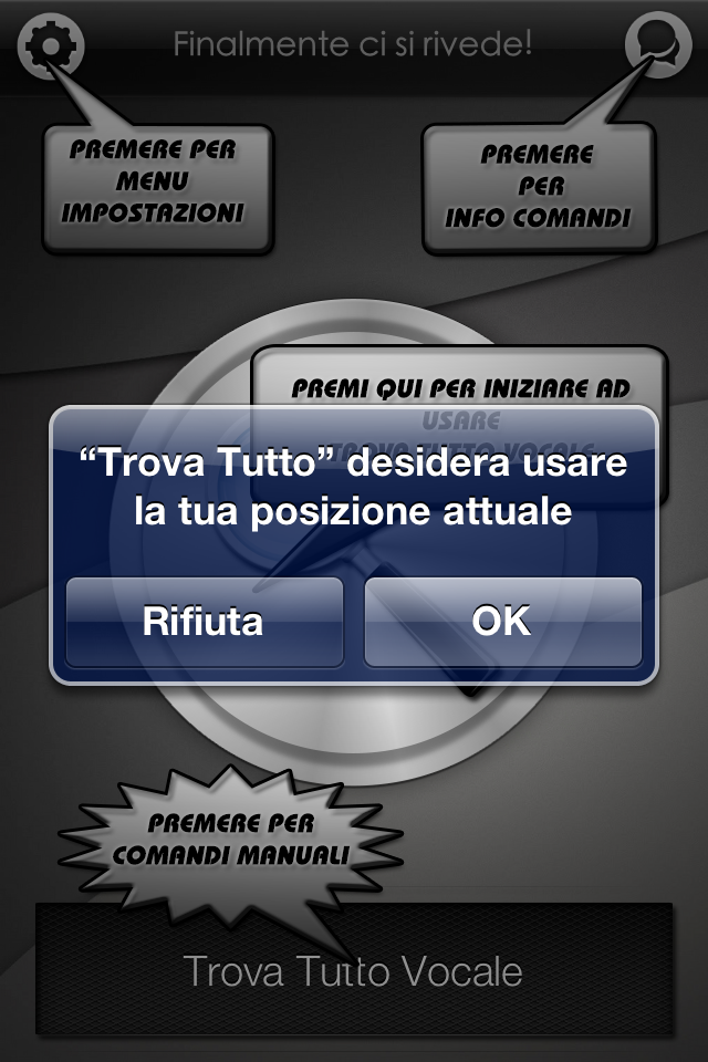 Avviando l’applicazione, vi verrà chiesto di attivare i servizi di localizzazione e di inserire il vostro nome. In seguito potrete scegliere di visualizzare un breve tutorial sul funzionamento dell’applicazione. In seguito, avremo subito di fronte la schermata principale, completamente rinnovata sotto ogni aspetto, ma sempre molto semplice con solo l’essenziale: un mega pulsantone centrale per avviare il riconoscimento vocale ed un pulsante inferiore per selezionare uno dei tanti comandi manualmente, nel caso in cui ci trovassimo in condizione di non poter parlare o in zone troppo rumorose.