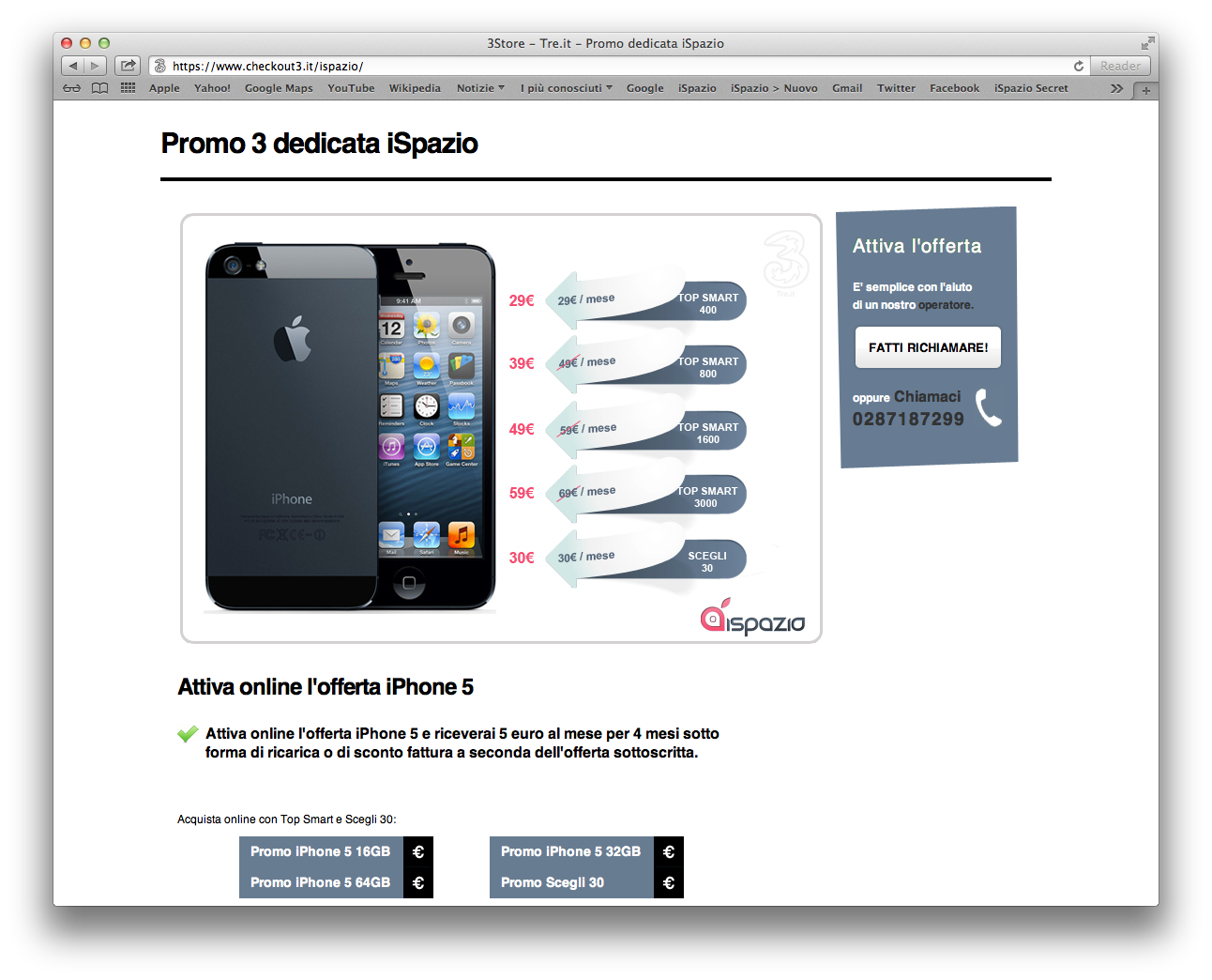 Il 28 Settembre, iSpazio ha annunciato una collaborazione con 3 Italia, che permette di acquistare l’iPhone 5 con un piccolo sconto. Oggi vi segnaliamo che Tre ha realizzato una pagina speciale, appositamente per noi, sul sito ufficiale, che semplifica la procedura d’acquisto beneficiando del nostro sconto.