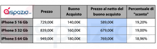 La promozione è infatti quella del buono acquisto di 20 euro ogni 100 euro di spesa. Acquistando un iPhone 5 si possono quindi risparmiare un po’ di soldi: