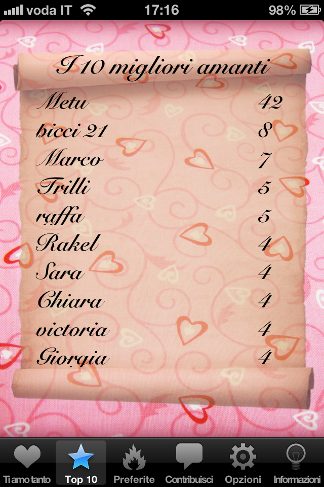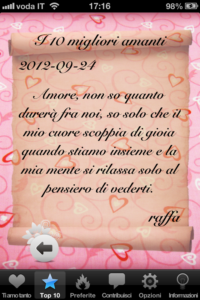 Nella sezione “Top 10” potrete visualizzare i migliori 10 amanti, ovvero coloro i quali hanno scritto ed inviato più frasi d’amore. Premendo sul nome dell’autore infatti potrete visualizzare le relative frasi.