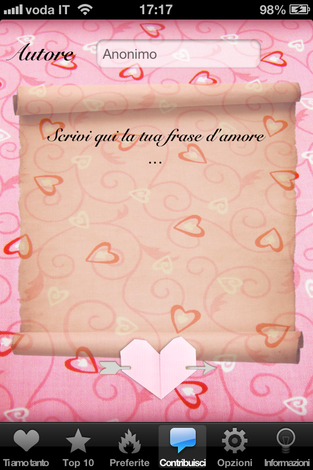 Passando ora alla sezione “Preferite”, potrete visualizzare alcune tra le più belle frasi d’amore, postarle su Facebook, inviarle via mail o via SMS. Se non siete ancora soddisfatti, grazie alla sezione “Contribuisci”, sarete voi stessi ad inserire la vostra frase d’amore che più preferite, la quale potrà essere inserita nell’app.