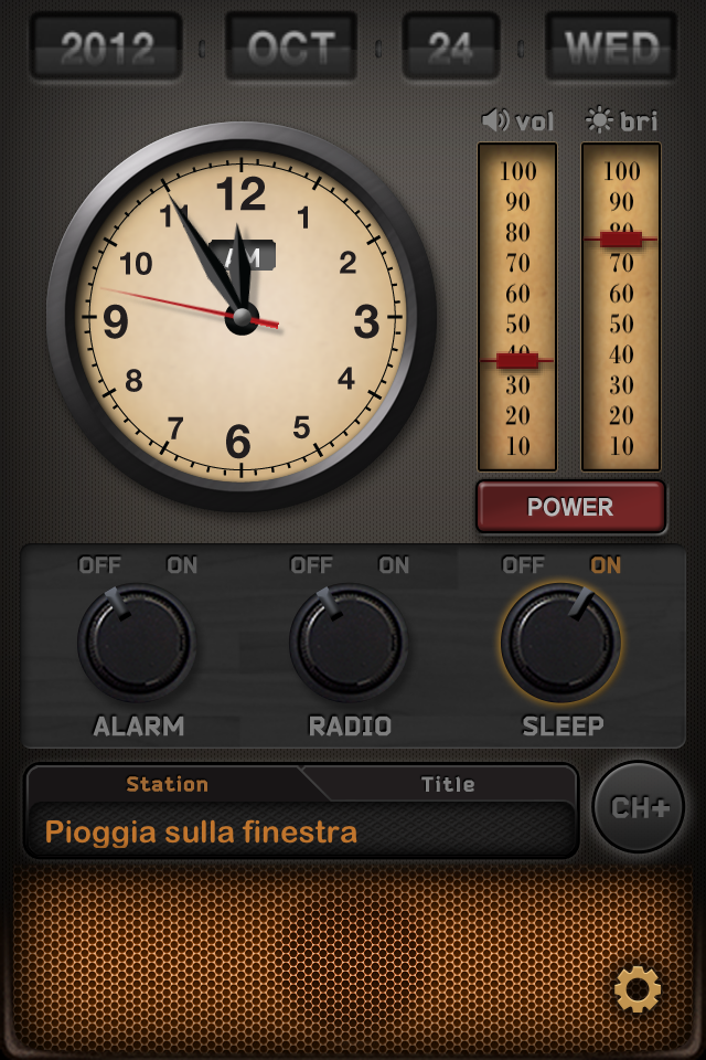 Avviando l’applicazione, visualizzerete subito la schermata principale, nella quale potrete notare in alto la data corrente ed al centro un bellissimo orologio analogico. Sulla destra di quest’ultimo, potrete modificare volume e luminosità, grazie a due indicatori molto vintage.