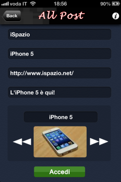 PostaTutto for Facebook è localizzato in italiano ed è compatibile con iPhone, iPod touch e iPad. Richiede l’iOS 5.0 o successive. Non è ancora stato ottimizzato per il nuovo iPhone 5.