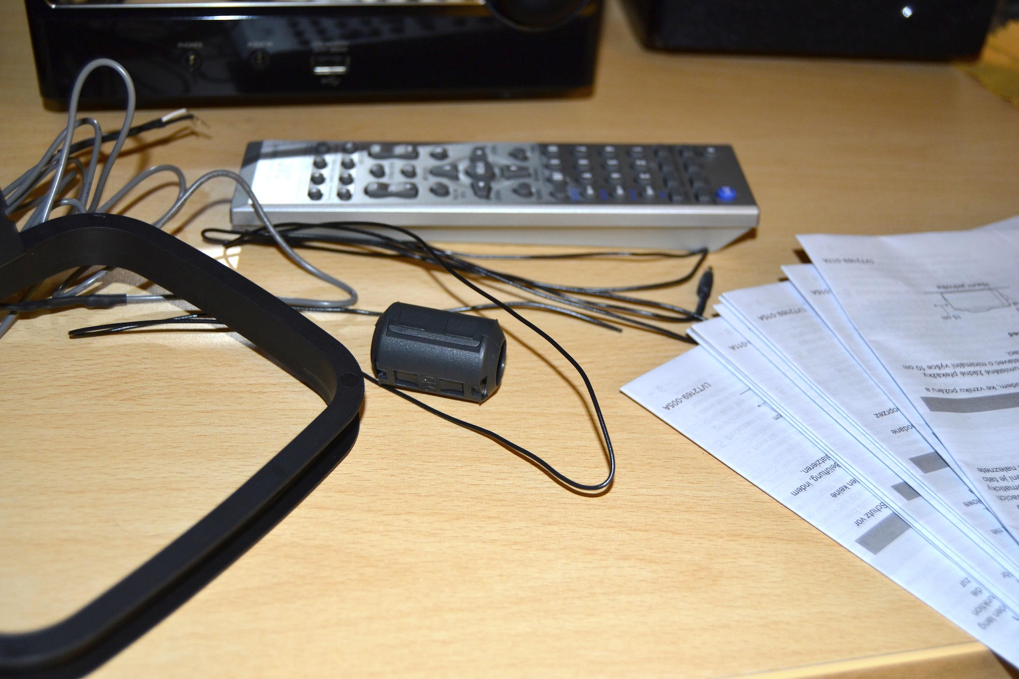 All’interno della confezione troviamo un telecomando con batterie incluse, i cavi di collegamento delle casse, numerosi manuali per venire incontro alle esigenze delle diverse nazionalità (quello italiano è presente) e due antenne per la radio, una di tipo normale (un normalissimo filo) e un’altra a telaio.