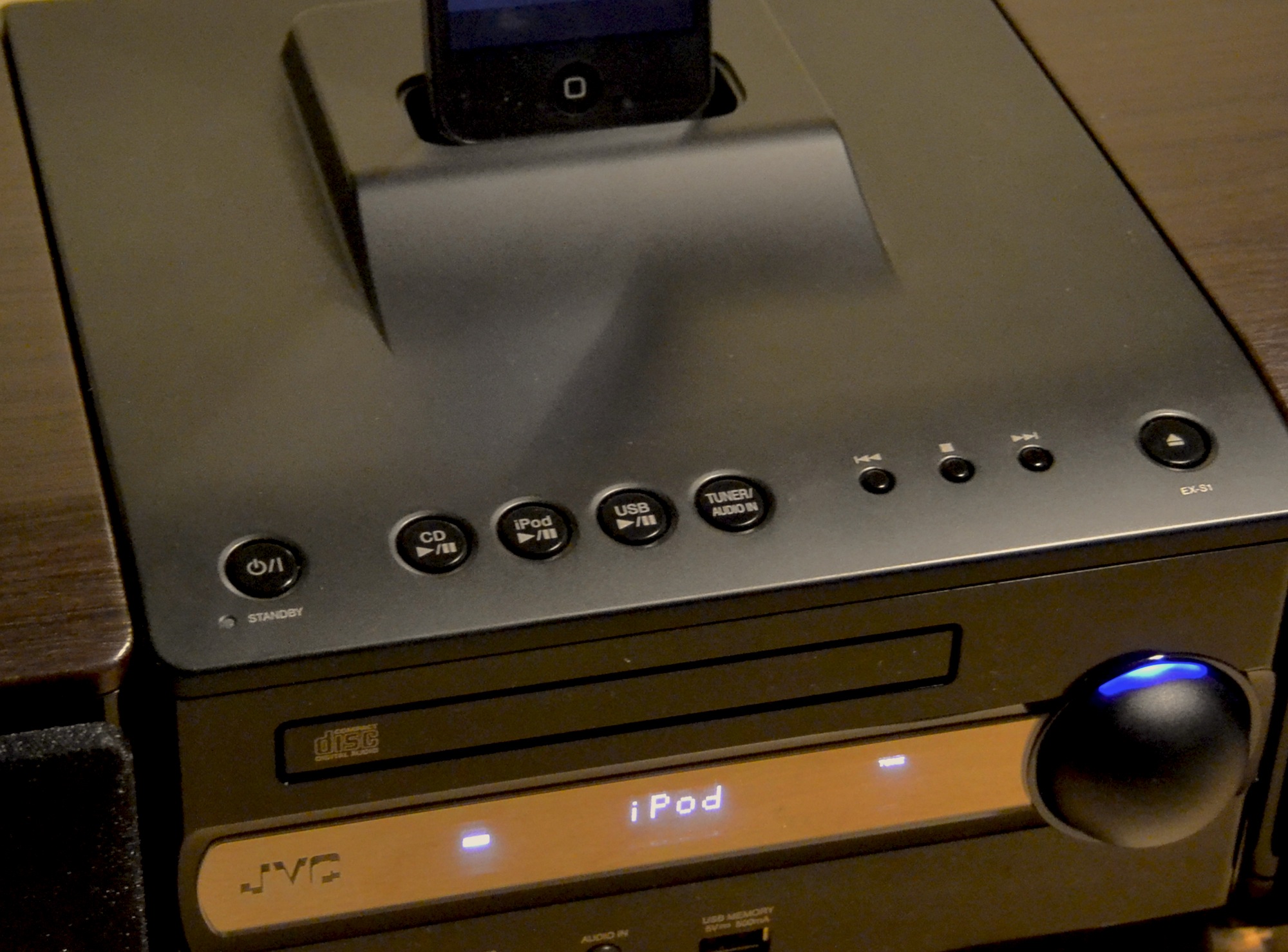 JVC EX-S1 è un sistema audio compatto e visivamente molto gradevole presentato da JVC nel tardo 2011. Si tratta di un sistema multi-blocco, costituito da una unità centrale in plastica e due altoparlanti in legno dal peso di 2 KG ciascuno.