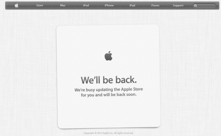 Breve articolo per annunciarvi che il sito Apple è offline e mostra il classico messaggio “We’ll be back” per il semplice motivo che stanno inserendo gli sconti per il Black Friday (evento che, come vi abbiamo annunciato qualche giorno fa, ci sarà domani).