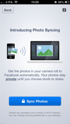 Photo Sync è la nuova funzione che, come spiegato brevemente nell’introduzione, ci permetterà di caricare in automatico le nostre fotografie che scattiamo tramite il nostro dispositivo. A caricamento ultimato potremo poi decidere se condividere, archiviare o eliminare le foto sempre tramite l’applicazione di Facebook. Al momento, le foto verranno caricate in un album privato quindi in ogni caso nessuno dei vostri amici potrà vedere le vostre foto.