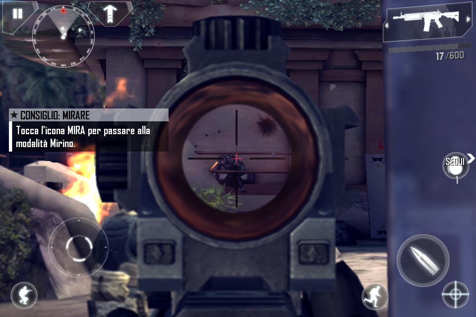 Come potete notare dalla foto qui sopra, troverete nell’angolo in alto a sinistra il pulsante di pausa, il mini radar per scovare la posizione dei vostri nemici ed il pulsante per accedere al Negozio Militare per acquistare svariate armi e potenziamenti. Nell’angolo in basso a sinistra avrete a disposizione il pulsante per accovacciarvi ed il classico pad virtuale per muovere il personaggio. Per muovere la visuale dovrete come sempre effettuare uno swipe sullo schermo.