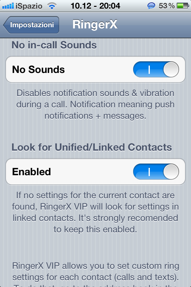 Una volta installato il tweak non noteremo nessuna nuova icona sulla Home Screen, ma verrà aggiunta una nuova voce all’interno delle impostazioni dell’iPhone. Inoltre all’interno della rubrica, selezionando un contatto, troveremo una nuova voce “RingerX VIP”. Il nuovo menu nella rubrica ci permette di personalizzare la notifica per il singolo contatto, mentre il menu all’interno delle impostazioni dell’iPhone ci permette le configurazioni generali e quelle delle singole App.