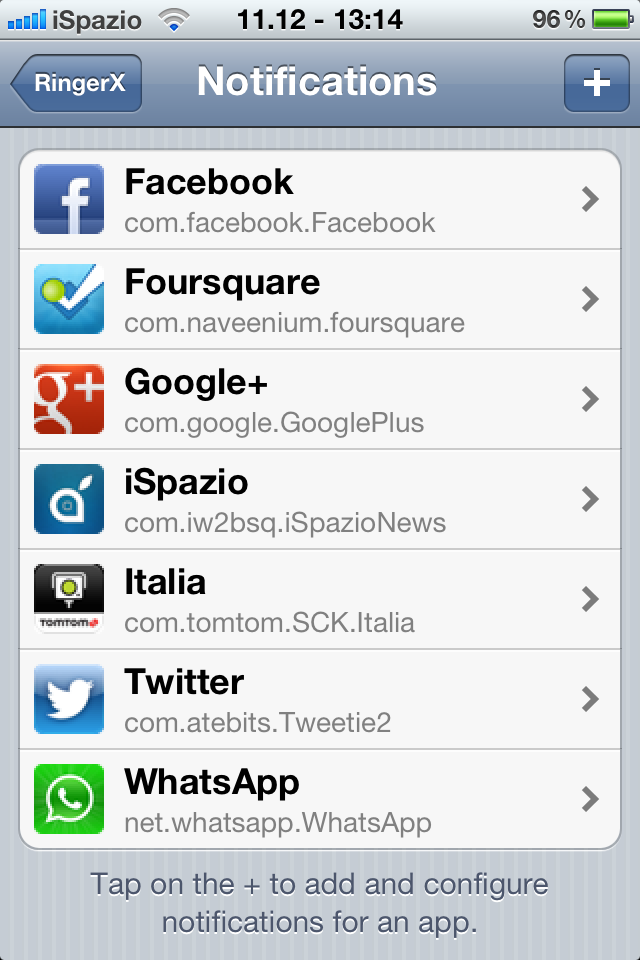 In questa schermata, con un tap sul tasto “+” potremo selezionare le applicazioni che ci interessano. Una volta in lista sarà possibile personalizzare gli avvisi di qualsiasi applicazione. Con un tap entriamo nel menu dove potremo applicare le seguenti personalizzazioni (seguendo l’ordine del menu):