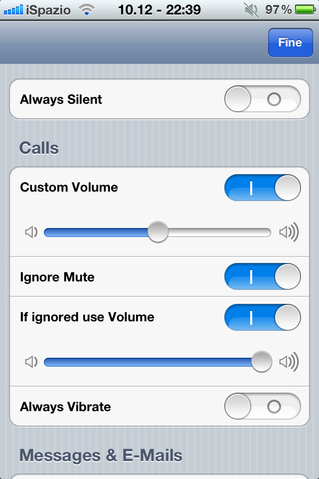 - Messaggi e E-Mail: ignora le modalità silenziosa e imposta un volume, vibrazione sempre attiva
