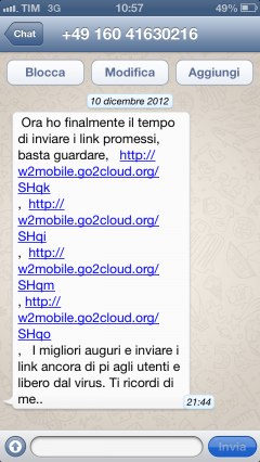 Come potete vedere dall’immagine, il messaggio contiene -oltre a svariati errori grammaticali- diversi link malevoli che possono prosciugare il credito telefonico e rubare i dati sensibili contenuti nella memoria dello smartphone in questione.