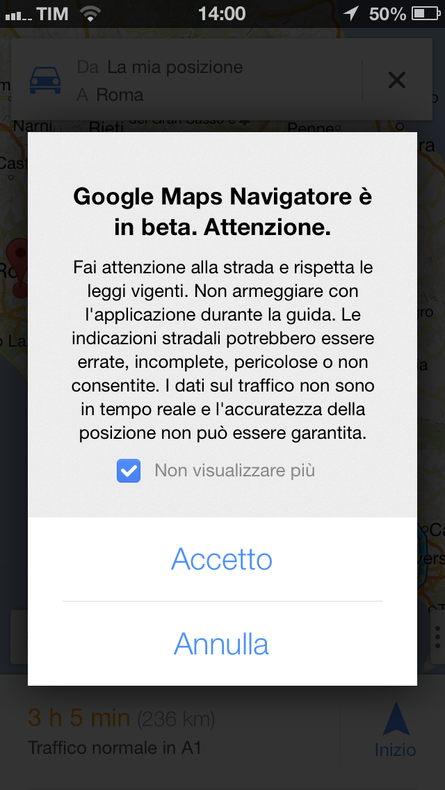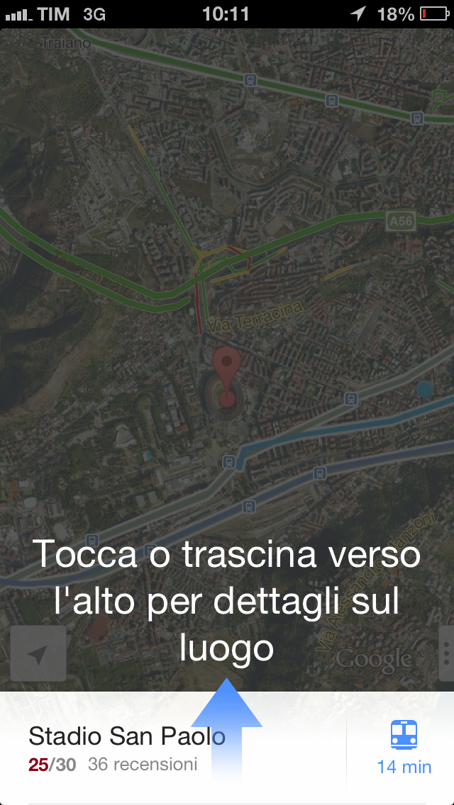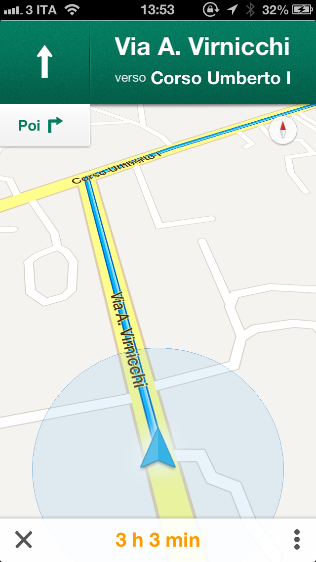 Se abbiamo ricercato le indicazioni per spostarci in auto sarà presente anche una freccia blu con la dicitura “Inizio“, con un tap sulla freccia potremo avviare la navigazione Turn-by-Turn. Questa modalità ci guida “passo-passo” fino a destinazione, quindi una sorta di TomTom. Durante gli spostamenti saremo supportati anche dalla voce che ci guida nelle svolte, ma questa è presente solo su iOS 6 e dall’iPhone 4 in poi.