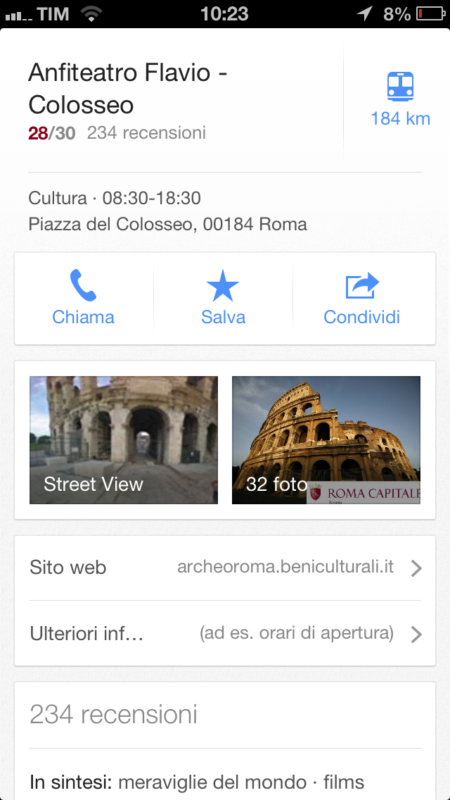 Tornado alla mappa principale, effettuiamo una ricerca oppure tappiamo su una posizione specifica per far comparire la banda delle informazioni e trasciniamola verso l’alto, oltre alla possibilità di accedere a Street View potremo eseguire le seguenti azioni: