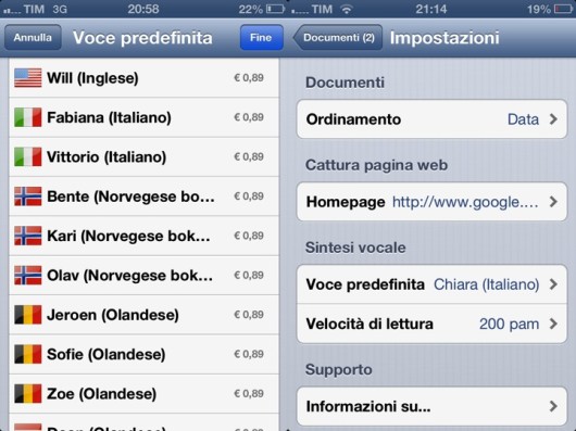 Tramite gli In-App purchase è possibile acquistare, al prezzo di 0,89 ciascuna, numerose lingue aggiuntive e voci come per esempio le due alternative per l’Italiano. I tipi di file supportati dall’app sono: