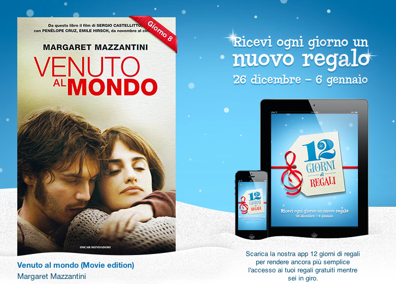 Come ottavo regalo Apple ha deciso di regalarci il libro Margaret Mazzantini “Venuto al mondo“, dal quale è stato tratto l’omonimo film con protagonista Penelope Cruz. L’e-book è disponibile nella versione “Movie edition” che al testo del romanzo, affianca la sceneggiatura di Margaret Mazzantini e Sergio Castellitto e alcune suggestive immagini fotografiche tratte dal backstage delle riprese.