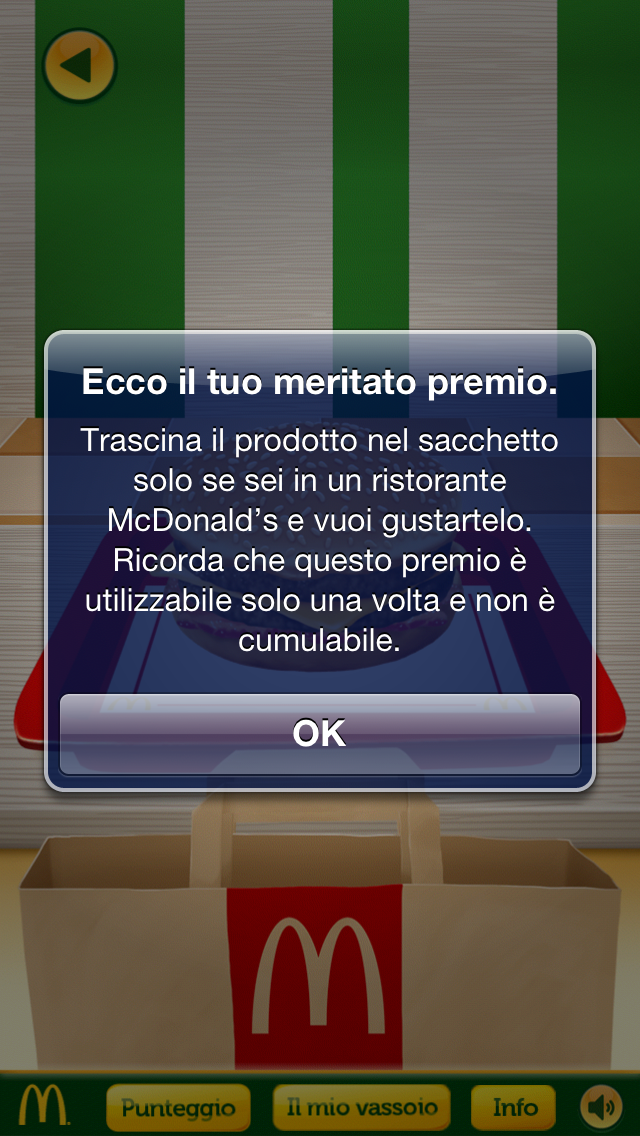 Per ritirare il tuo premio, dovrai recarti presso uno dei nostri ristoranti McDonald’s aderenti e, in presenza del crew che troverai alle casse, dovrai entrare nella sezione “Il mio vassoio”, trascinare col dito l’icona raffigurante il premio vinto dentro al sacchetto di carta e confermare di voler consumare il prodotto. A quel punto non ti resta che gustarti la vincita!