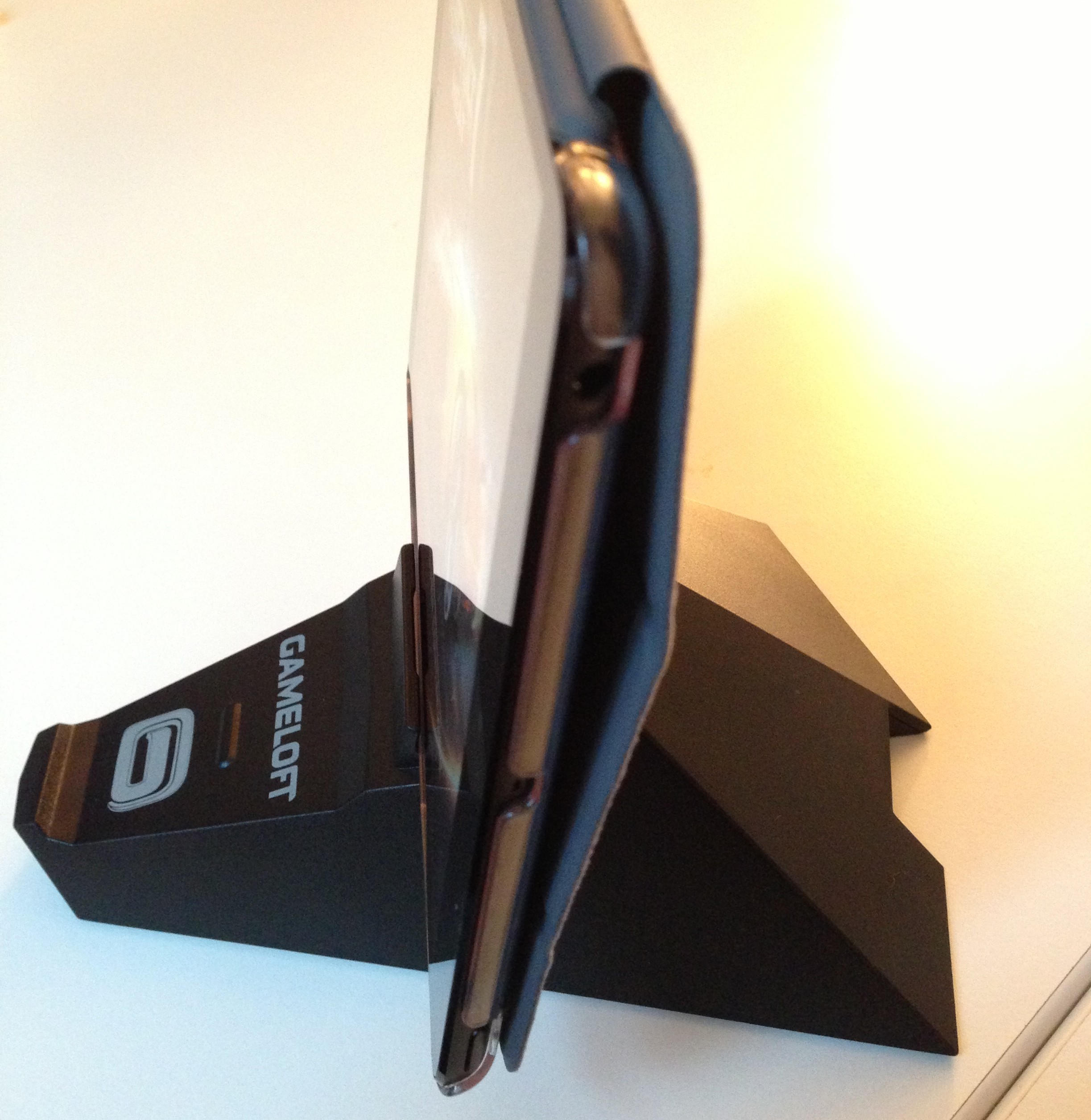 Lo stand ha una forma originale e permette di reggere tutti i nostri iDevice sia in orizzontale sia in verticale offrendo un angolo di visione ottimo nel caso in cui lo poggiassimo su di un tavolo. Lo slot è abbastanza largo da permettere di utilizzare anche protezioni poco ingombranti come cover e smart cover (in questo caso l’angolo varia leggermente). Lo stand è studiato per permettere il passaggio del cavetto 30pin, ma anche lightning, che è possibile utilizzare posizionando il device in verticale.