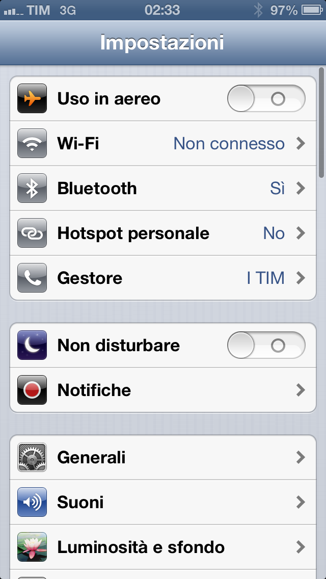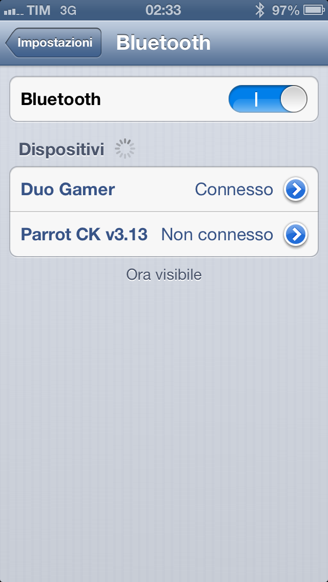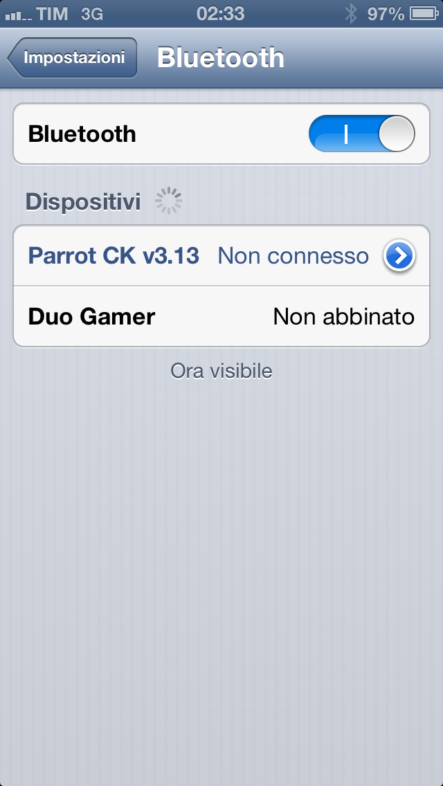 - Attiviamo il Bluetooth sul dispositivo: Impostazioni -> Bluetooth e attiviamolo (su iOS 5 o precedenti Impostazioni -> Generali -> Bluetooth)