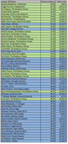 La rivista Fortune ha raccolto una statistica composta da 57 analisti, professionisti ed indipendenti, con i risultati individuali riguardo a quanti iPhone sia riuscita a piazzare sul mercato Apple. I risultati sono impressionanti in tutti i casi e riportano una crescita forte, anche se non paragonabile a quella avuta nel dicembre 2012.