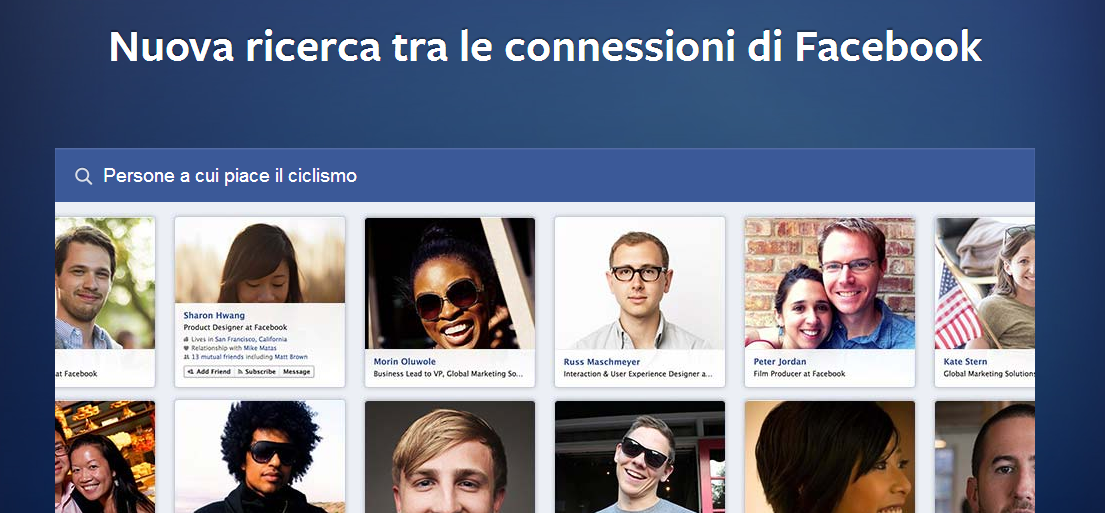 Mark chiarisce che non si tratta di un classico motore di ricerca di informazioni su web. La ricerca si focalizzerà invece su tutti i contenuti condivisi dagli utenti del social network: amici in comune, luoghi, like, foto, commenti e tag saranno accessibili in modo istantaneo e pratico.