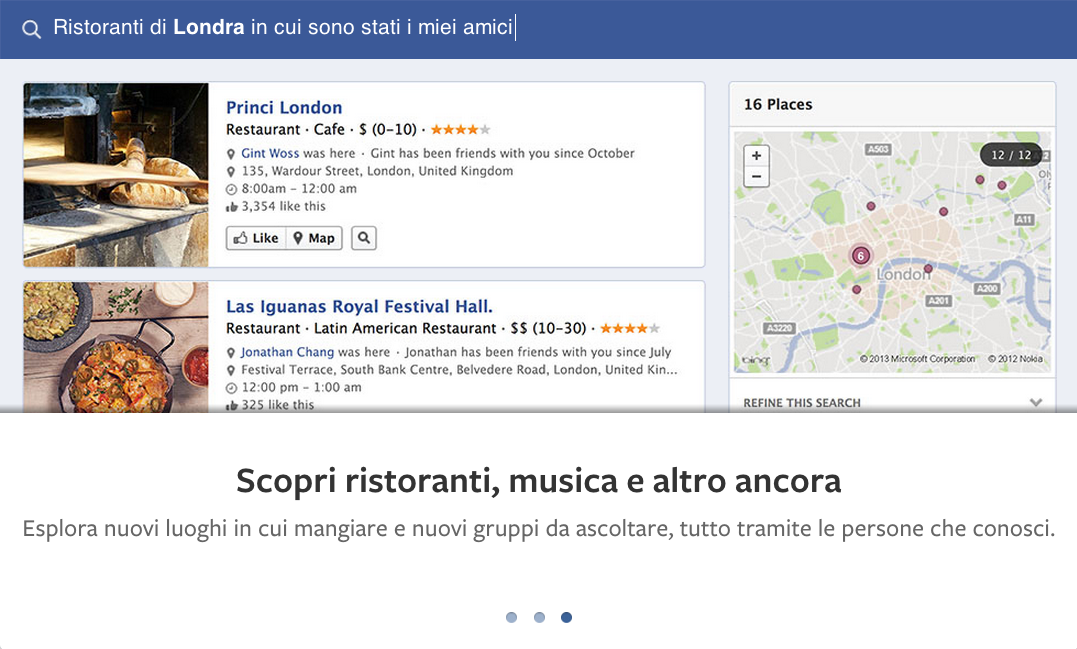 La potenza di questo motore di ricerca sta nel fatto che possiamo filtrare ed affinare la nostra ricerca, ad esempio: “A quali amici che vive nella mia città piace il calcetto?” oppure “Chi dei miei compagni di scuola è stato a Roma?” ma anche “Quali sono le pizzerie a Napoli preferite dai miei amici che vivono a Napoli?“.