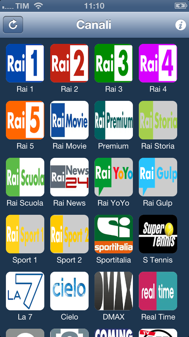 iTelevision utilizza i collegamenti disponibili in rete per lo streaming dei principali canali italiani. L’app è strutturata in maniera particolarmente semplice, lasciando spazio ad una grandissima schermata contenente la lista di tutti i settantadue canali disponibili. In questa abbiamo a disposizione due tasti, uno per aggiornare la pagina, e l’altro per accedere ai contenuti informativi dell’app.