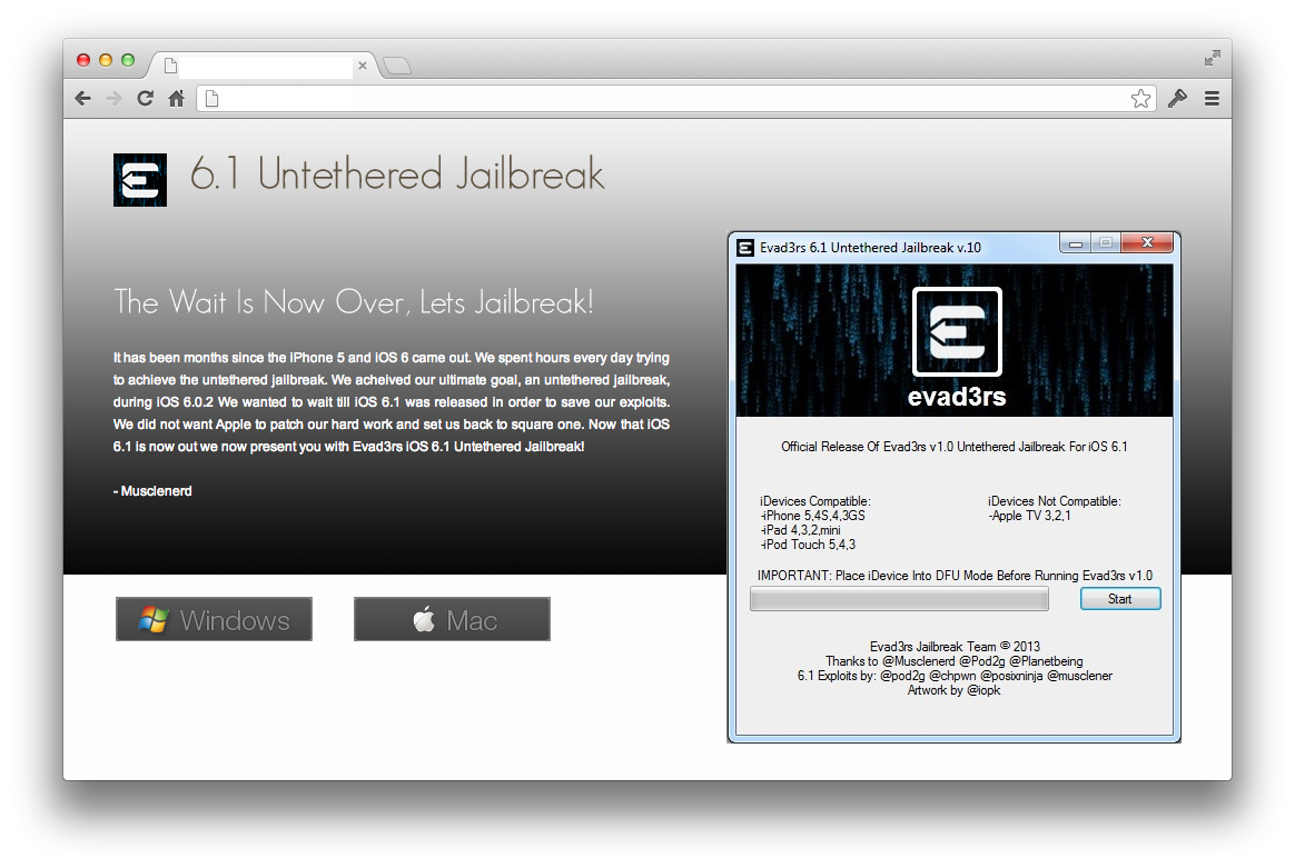 – Al lavoro sul Jailbreak Untethered per iOS 6.1 troviamo un gruppo di hacker eccezionale, composto da: @pimskeks @planetbeing @pod2g e @MuscleNerd che insieme formano il team @evad3r. La formazione ufficiale del team è stata annunciata da pod2g e riguarda proprio lo sviluppo del Jailbreak per iOS 6.1 di tutti i dispositivi mobili Apple.