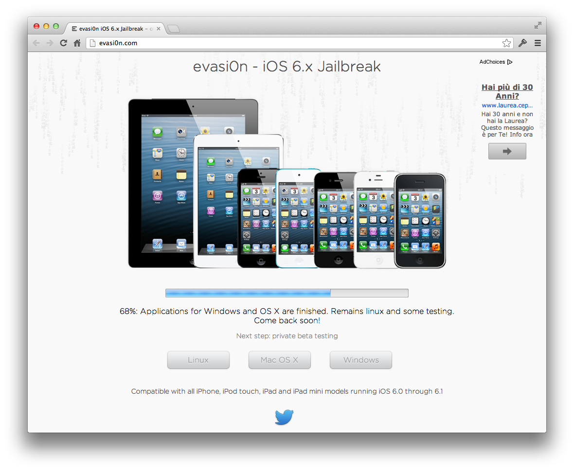Dopo aver aggiornato il sito portanto la percentuale di completamento del tool per il Jailbreak di iOS 6 al 91%, gli hacker hanno fornito maggiori dettagli tramite Twitter, annunciando ufficialmente che il Jailbreak sarebbe stato rilasciato “domani”, quindi lunedì.
