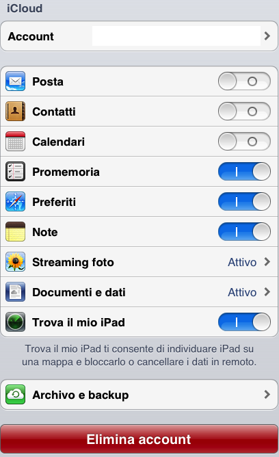 4: Entriamo sulla pagina relativa alle impostazioni della vostra casella di posta elettronica iCloud e disabilitiamo Contatti dalla lista delle sincronizzazioni attive sull’account