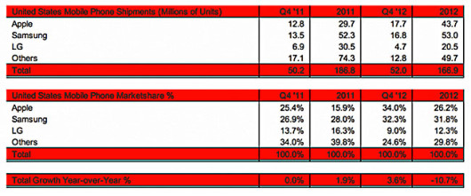 In base a quanto riportato da Strategy Analytics, Apple è il più grande produttore di telefoni cellulari in America, per quanto riguarda il solo Q4 2012, superando Samsung per la prima volta nel numero di unità vendute.