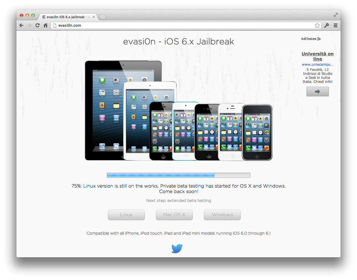 Dopo l’ultimo aggiornamento siamo passati dal 68% al 75%. Sono ancora in corso i lavori della versione di evasi0n per il sistema operativo Linux, mentre sono in fase di beta testing le versioni per Mac e Windows. Per ora la versione beta è stata affidata solo ad un gruppo ristretto di persone per eseguire alcuni test, il prossimo passo è quello di estendere questi test.
