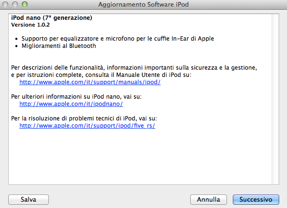 Per poter eseguire l’aggiornamento è sufficiente collegare l’iPod nano al computer ed avviare iTunes, se il messaggio non compare in automatico, provate ad eseguire la sincronizzazione della musica.