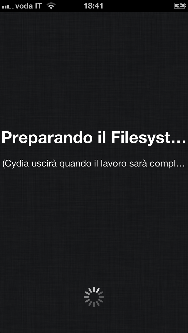 NOTA: questa fase dura massimo 5 minuti (su iPhone ripristinato come nuovo prima di eseguire il Jailbreak), se dopo 10 minuti il dispositivo resta bloccato su questa schermata eseguite un riavvio forzato premendo contemporaneamente per 10 secondi il tasto Home ed il tasto Power. Dopo il riavvio troverete l’icona si Cydia, altrimenti ripristinate ed eseguite la procedura.